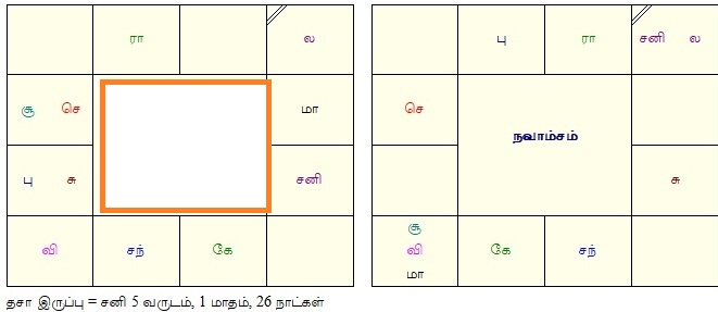 8.நவாம்சத்தில் லக்கினத்திலேயே 8ம் வீட்டுக்காரன் சனி. 7ம் இடத்தில் சூரியன் ,குரு மாந்தி.ராசி நவாம்சம் இரண்டிலும் சூரியனும் சனியும் எதிர் எதிர் நின்றது.